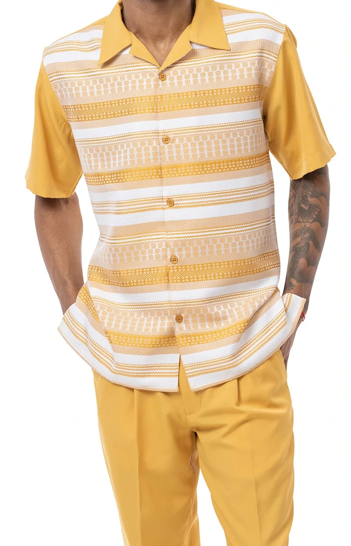 Gold 2 Piece Short Sleeve Men’s Summer Walking Suit Horizontal Stripe Pattern