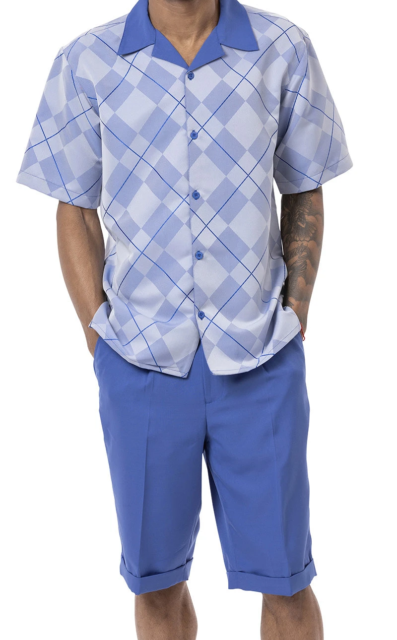 Royal Blue 2 Piece Short Sleeve Walking Suit Argyle Pattern With Shorts