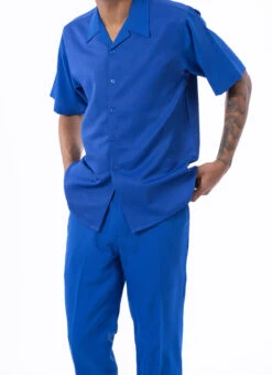Cobalt Blue Walking Suit Tone On Tone Vertical Stripes 2 Piece Short Sleeve Set With Shorts