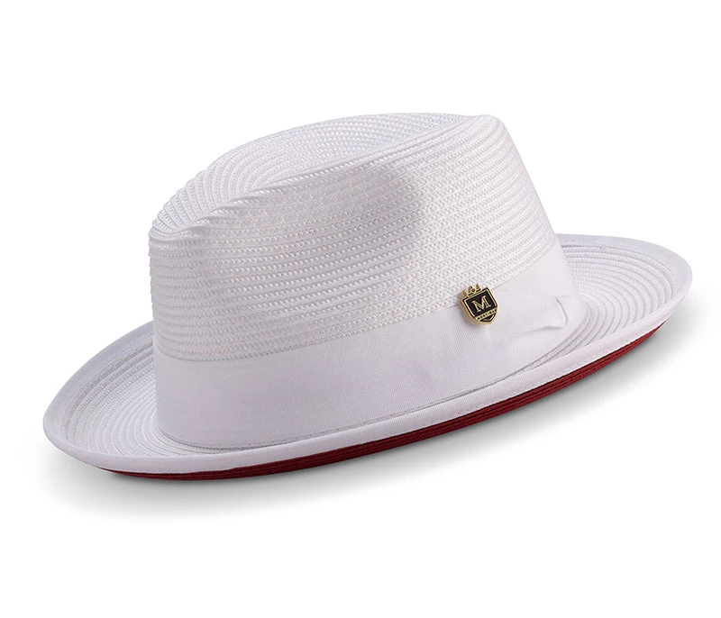 White Wide Brim Braided Pinch Fedora Hat With Red Bottom