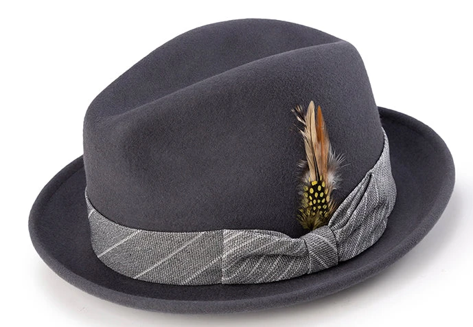 Wool Felt Pinch Front Gray Fedora With Feather Accent